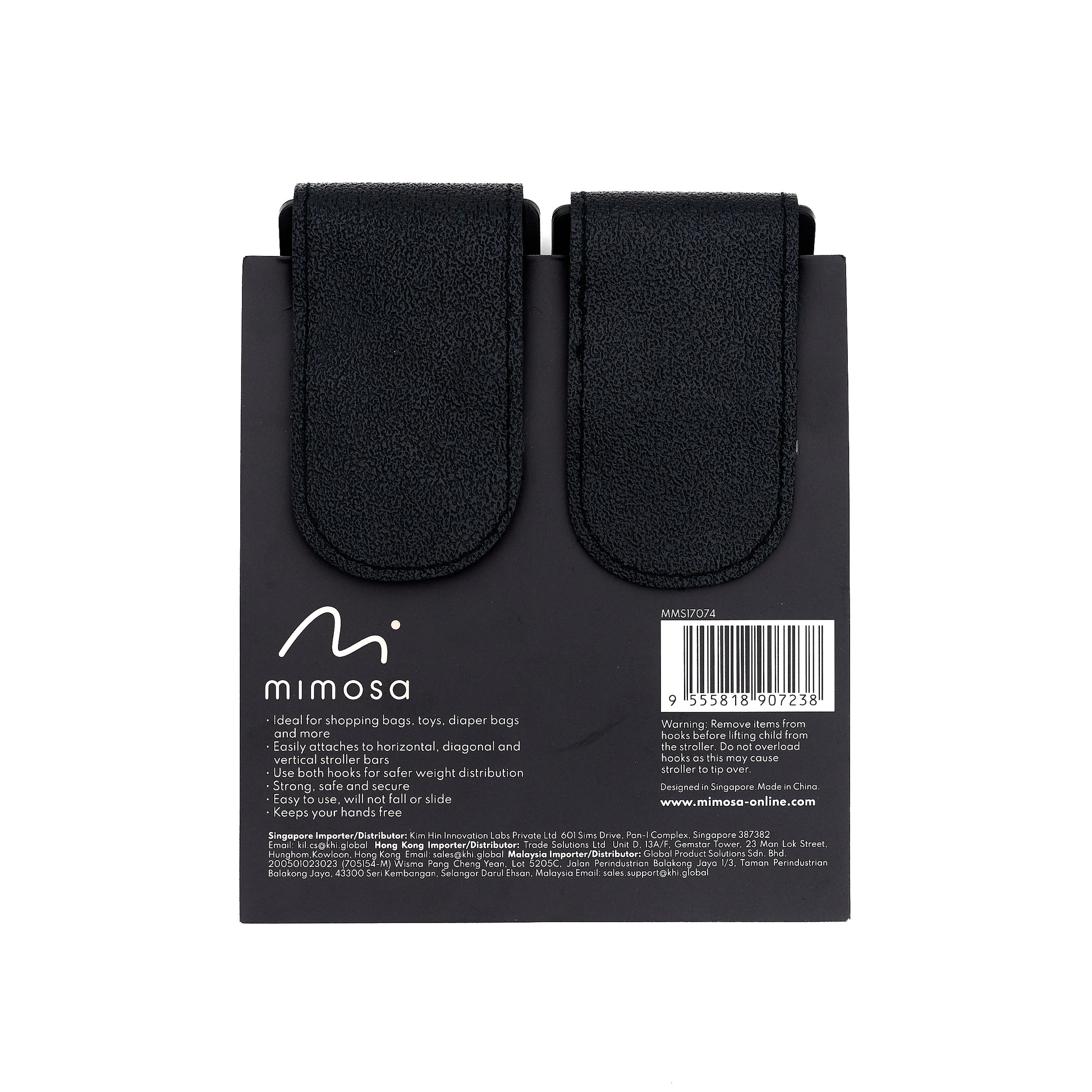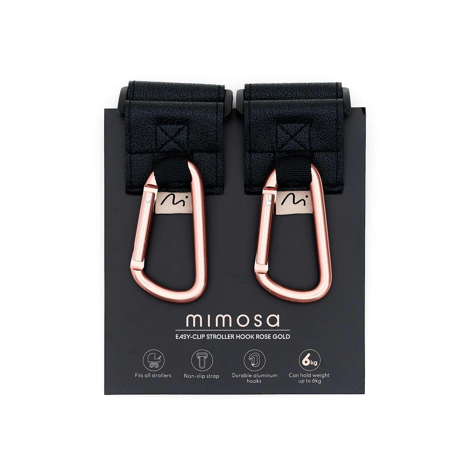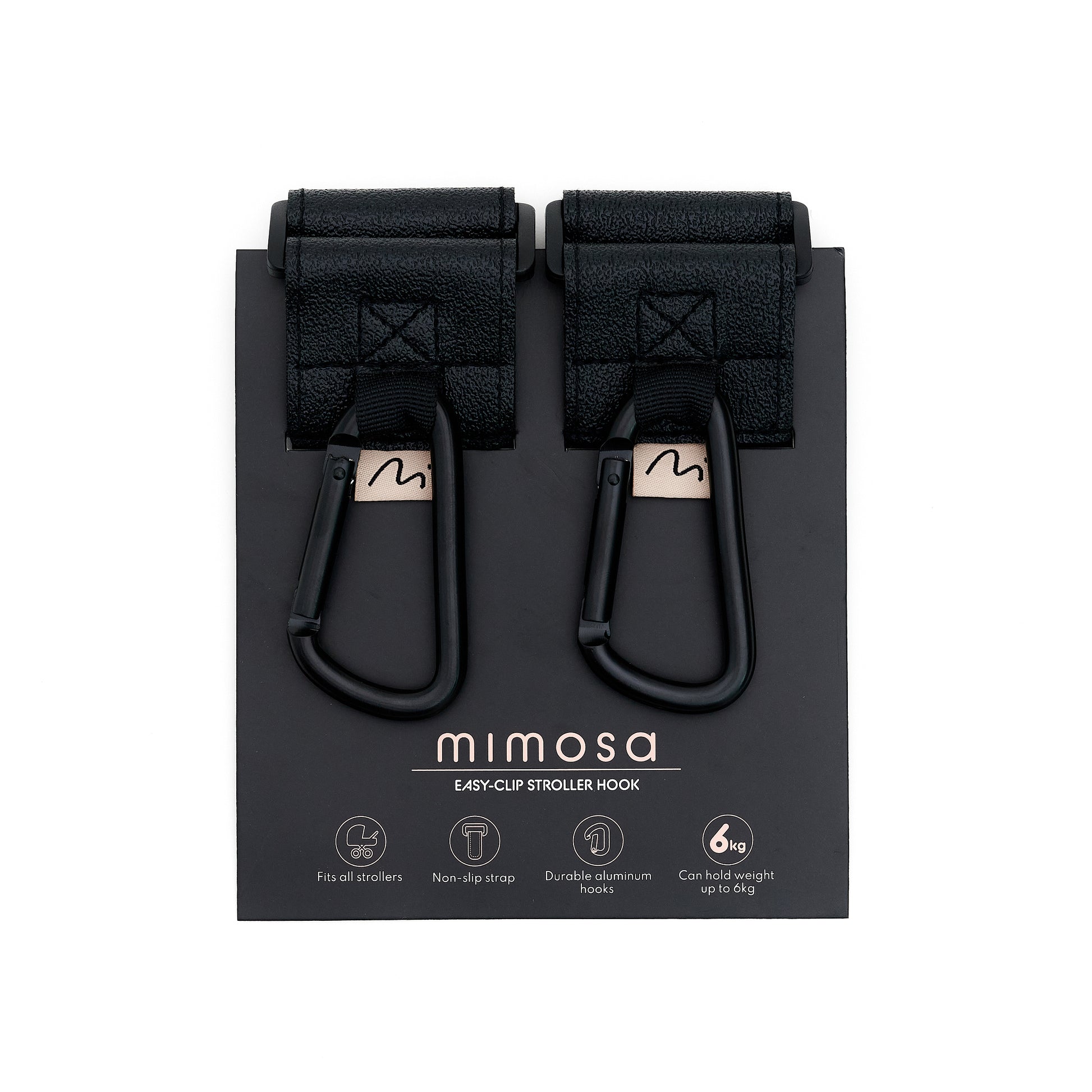 Mimosa Easy-Clip Stroller Hooks provide parents with a convenient and easy way to attach shopping bags, purses, toys, and more to their stroller. Its non-slip strap fits almost any stroller or shopping cart and can easily to be attached to horizontal, diagonal and vertical stroller bars. Durable aluminum metal hooks discourage cracking and breaking, and the spring hooks discourage theft. Packaged in a 2-pack which allows for safer weight distribution. Free your hands by using the Mimosa Easy-Clip Stroller Hook at the mall, on a walk, wherever you want.